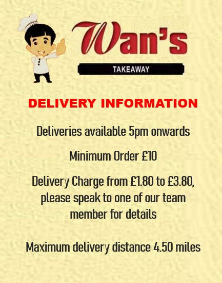 Wan's Takeaway Chinese Takeaway serves variety of delicious Chinese dishes. We’re passionate about delivering hot, great tasting, freshly prepared Chinese food to our customers